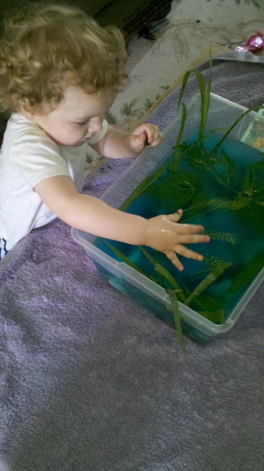 I wanted to try something new with this sensory water bin, so while I was outside walking Kaede, I plucked a few leafy plants. I ended up picking out 4 different kinds that looked similar enough to plants that grow in the ocean. These were supposed to be seaweed for our mini ocean. I used blue Play-Doh to weigh them down. I basically rolled a small ball and stuck the ends of the grass into it, then I submerged it into the water and stuck it to the bottom. In the future I won't use this method for weighing them down because the Play-Doh became really mushy quickly. Honestly my kids loved that and had so much fun playing with the yucky Play-Doh, but it didn't make great anchor material.