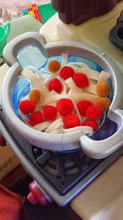 When the pasta was finished cooking, they added in some yummy ingredients! Juicy red tomatoes and some meatballs (we use the light brown pom poms for pieces of "cut-up sausage" and "chicken meatballs", the dark brown pom poms are "beefy meatballs" - specifically "beefy" not "beef"). This is a fun way to work on coordination and developing fine motor skills by adding, stirring and scooping the pom poms.